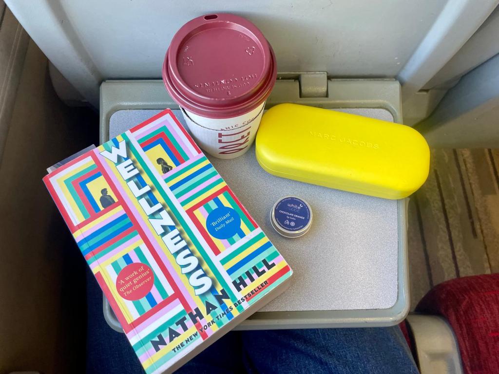 So this was my ‘survival pack’: a lukewarm black filter coffee, my reading specs, and “Wellness” by Nathan Hill.